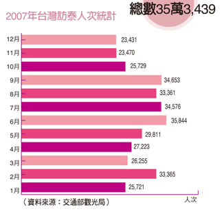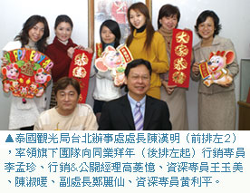 泰國觀光局今年以7大主軸推廣觀光,計有「泰國生活藝術」、「歷史遺跡」、「海灘」、「時尚」、「自然」、「健康」、「慶典」,還有82個金品行程的推薦。泰國觀光局台北辦事處處長陳漢明表示,今年將針對FIT市場、獎勵旅遊市場、及新景點包裝做為宣傳重點。同時要在新的一年,向所有同業表示感謝,期望2008年的泰國觀光旅遊能更上一層樓。