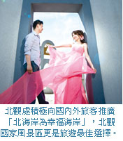 同時,為推廣北海岸婚紗旅遊與野柳地質公園特殊地景,北觀處將帶領轄區觀光產業相關業者遠赴東南亞地區,參加6月香港、7月新加坡與8月馬來西亞等旅展共同行銷推廣;並安排6月邀請港、星、馬地區之主力媒體至北海岸進行3天2夜之熟悉旅遊,藉由國際媒體報導將「北北基」觀光旅遊線產品,以及「北海岸為幸福海岸,北觀國家風景區為國際化旅遊目的地」之訴求,推向國際舞台。