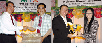 1. 菲律賓觀光部副部長亞布洛(左)與甲聯會會長李謙宏交換紀念品。