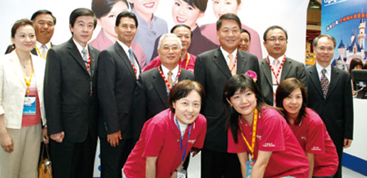 華航總經理孫洪祥(第二排右3)、華航台灣地區處長余劍博(第二排右4)、華航台灣地區行銷副總經理董國樑(第二排右5)與華航同仁們皆到華航攤位共襄盛舉。
