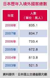 推動已邁入第7年的VJC計畫,從2003年開始以來每年的入境總人數都呈現成長的狀況,但是從去年7月左右開始,受到日幣高漲以及整體經濟狀況不佳等因素的影響,開始呈現下滑的趨勢,以2008年7∼12月而言,相較於去年便有8.8%的跌幅,今年1∼4月的單月跌幅更都在18%以上,可說是受到相當的衝擊。