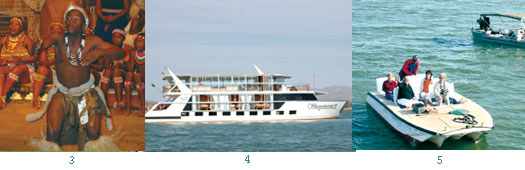 3.Protea Hotel Shakaland飯店園區表演祖魯舞蹈與歌曲。4.Shayamanzi號是Pongolapoort極受歡迎的度假船屋。5. 居住Shayamanzi船屋還可免費體驗釣魚的課程。