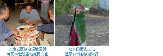 而衣索匹亞飛速的經濟成長帶動當地旅遊熱潮。這裡原就是旅遊資源豐富的國家,悠遠的歷史為這裡留下相當多文物古蹟,再加上彷彿無限延伸的草原、灌木森林,以及種類多元的野生動物等自然景觀,旅遊資源可說相當豐富,在硬體設備逐漸提升之後,更是吸引世界各地金字塔尖端客層到此探訪。高寶是台灣首個推出衣索匹亞相關產品的業者,高寶旅行社總經理吳唐生說,台灣旅客前往當地的機會,每年不會超過100人,而在高寶之後雖也有業者跟進,但主題內容大異其趣。
