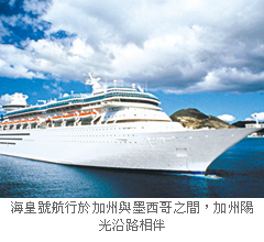 從台北抵達洛杉磯,隔天登上海皇號入住5星級移動式海上飯店,免除帶行李、拉車及找餐廳的困擾。陳建佑補充說,合理的價位、免陸上奔波之苦、全程五星級享受、主題樂園一個也不少,加上船上每晚都有秀可看,更好玩也更多元,比較大部分美西行程必去的賭城拉斯維加斯,陳建佑說,「賭城路途遙遠,海皇號上的博奕也可滿足遊客。」