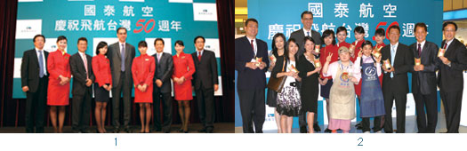 1. 國泰航空歡慶50週年,國泰航空企劃部經理陳志智(左1)、行銷部經理凌維謙(左3)、台灣暨韓國區總經理賀安(左5)、機場經理胡親民(左7)、企業傳訊暨客戶關係部副理侯恩錫(左9)。