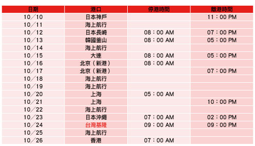 而今,國際性遊輪公司也嗅到兩岸春暖花開,終於在今年首度計畫抵達台灣,此航次於10╱10由日本神戶出發,為期14天的航程,中間停靠日本長崎、韓國釜山、中國大連、北京、上海、日本琉球、台灣基隆,最後在10╱25抵達香港。荷美遊輪旗下共有15艘艦,本次造訪台灣的船隻為華倫丹號(Vo l e n d am)。華倫丹號總排水量為63,000噸,載客1,432人,船員647位,共有10層載客甲板,船上擁有價值美金300萬的藝術品以及工藝收藏品。於船上展示藝術品的傳統,始自1883年的新鹿特丹二世。以荷蘭大探索時期為主題的收藏,使人們重新體驗一個冒險和探索的年代。特別為此遊輪所創造的藝術真跡,也在各公共場所和艙房陳列。