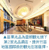 雲朗觀光定位為精品飯店的「兆品酒店」繼嘉義兆品後,第2家則是由竹南中信大飯店整建而成的「苗栗兆品酒店」,同時也是苗栗縣目前首座及唯一的國際級觀光飯店,這座足以讓大苗栗鄉親引以為傲的「客廳」,讓竹苗觀光行旅不再只是過程而是目地。