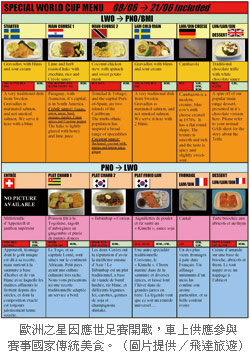 歐洲之星為慶祝此盛大活動,6月8日~6月21期間推出世足賽特色餐點。旅客搭乘頭等艙及一等艙,即可在列車上品嚐參賽國家傳統美食。