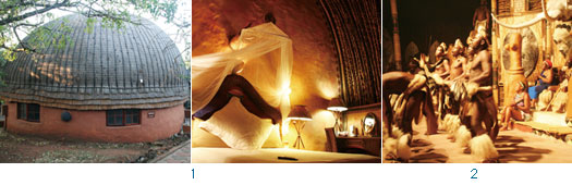 1.原頂的建築是祖魯族的傳統藝術,每棟圓形建築可以隔成兩個客房,客房內擺設藤製家具、衛浴設備新穎。