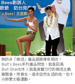 Burt’s Bees認為唯有尊重自然、愛護地球,才是人類永續生存之道,產品熱銷後更是積極投入自然生態維護與環境教育宣導工作,據了解,其為保護大自然生態而投入的金額已超過五百萬美元,近年來更為促成緬因州原始森林生態保護區多方請命與募款。Burt Shavitz當年他就是因為希望簡單的生活而居住於緬因州,如今雖然Burt’s Bees聲名大噪,但小蜜蜂爺爺仍一本初衷,不僅信守當年友善地球、回饋地球的承諾,堅持不因量化而過度開採,大部分時間仍居住在森林小屋過著彷如清教徒般沒水、沒電的生活,他本人就是樂活生活的實踐者,被Burt’s Bees愛用者譽為「樂活教主」,太極運動則是他平日最愛。
