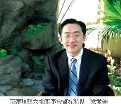 梁愛迪還進一步提到,未來理想大地的發展,「我們核准開發土地為150公頃,但目前園區僅8公頃,當初在建園時是整體的設計,就等下階段陸續完工。另外,我們也是國內唯一一家與國際連鎖的萬豪酒店集團(Marriott)簽約的飯店,在硬軟體設計都符合集團標準,目前僅缺少國際會議廳的設施,這也是未來建設重點之一。」而持續堅持創造一種理想環境、自然和諧、身心靈舒暢的純度假方式,並在園區內僅看到3頭(木頭、石頭、銅頭)與水等四元素,遊艇用電動模式、馬桶省水裝置等等,都是理想大地對環境表達的敬畏之心。