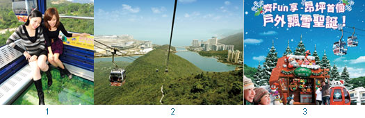 1.昂坪水晶纜車讓旅客可以全方位俯瞰香港的秀麗景觀。(圖片提供>天擎旅行社)2.昂坪纜車是現在到香港的必遊景點,在搭乘纜車的過程中,可以欣賞大嶼山與南中國海交織成的藍與綠的自然美景。(圖片提供>天擎旅行社)3.昂坪360將在今年冬季舉辦「首個戶外飄雪聖誕」,讓旅客在昂坪市集感受白雪飄邈的香港聖誕節。(圖片提供>天擎旅行社)