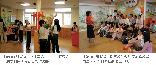 以故事為引子,深入淺出的將建築節能的各項概念融入故事中,並以互動式教具展出,讓兒童親身體驗節能設備及建材的神奇。」例如:人力腳踏車經過驅動轉換為電能,可以讓牆壁上10個螢火蟲燈泡發光發電;而將屋外陽光經太陽能收集器由光纖組及其投射裝置導入室內,可明顯感受太陽光源轉換之強弱性;另外針對節能屋外部牆面材質的認識,從操作中體認隔熱材質的優劣。這些寓教於樂的互動式教學方法,吸引參觀小朋友們的興趣,不僅個個搶著實際操作體驗,就連大人們也聽得津津有味。