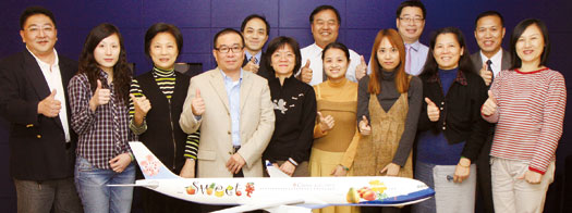 ▲(前排右起)三賢旅行社陳美秀、大登旅行社商務部經理李麗琴、豐華旅行社團體部線控吳雅仙、鳳凰國際旅行社日本線游喬婷、良友旅行社日本部襄理黃淑玲、永盛旅行社團體旅遊處日本線經理徐秉鈞、理想旅運社協理葉明復、京城天下旅行社韓國日本線控陳佩芳陳佩芳、向陽國際旅行社鄭天任。(後排右起)華航台北分公司客運營業部業務副主任沐長青、汎佳旅行社副總經理梁廷佑、華航台北分公司客運營業部經理郝光復、華航台北分公司客運營業部商務組主任盛重德。