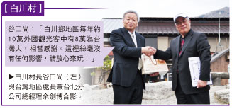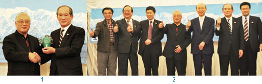 1.中華航空台灣地區處長兼台北分公司總經理余劍博(左)與日本政府觀光局理事長間宮忠敏互贈紀念品。2.歡迎晚宴上富山縣知事石井隆一(右3)與團員合影。