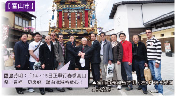 考察第二晚於富山市展開歡迎晚宴,席間富山縣知事石井隆一表示,縣內針對包含農漁產等每天都有測量並公布數據,目前皆在安全範圍內,遊客可放心前來。同時日本政府觀光局理事長間宮忠敏也特別來到現場,除了大力感謝台灣國人在震後表現的支援溫情外,也再次強調西日本及北陸地區皆平安無事。