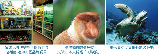 此外,馬來西亞熱帶雨林是世界上最古老的雨林區,區內各類奇花異草、珍奇異獸宛若天然的展示櫥窗,許多〈國家地理雜誌頻道〉才能看到的場景在這裡都能親身體驗,最特別的就屬深入雨林秘境探訪長鼻猴了。長鼻猴造形與日本民俗祭典中的天狗面具頗神似,因此日本人又稱它為「天狗猴」,成年的長鼻猴體形巨大,有一個又大又長的鼻子,長相怪異,宛如卡通造形人物。