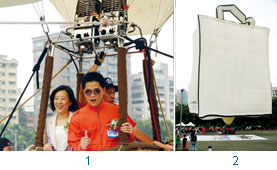 1.台東縣長黃健庭(右1)與經濟部國際貿易局主任秘書江文若邀請全民參與空前盛會。2.來自杜拜的30公尺巨型購物袋熱氣球升空為熱氣球嘉年華造勢。