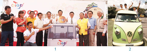 1.「全家出遊999,歡樂全台趴趴走」遊程,啟動儀式在眾貴賓的見證下正式起跑。2.經濟部中小企業處處長賴杉桂( 左)與知名外景節目主持人Tomorrow,搭上象徵起跑的專車。