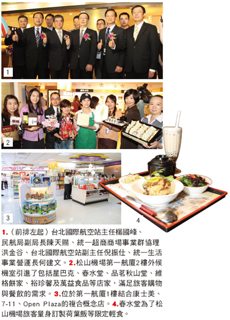 而在2樓外候機室的伴手禮專賣店,則有春水堂品茗秋山堂、維格餅家、裕珍馨及萬益食品等,餐飲部分則引進星巴克與春水堂。春水堂還特別因應機場需求,訂製適合旅客需求的荷葉飯等限定輕食,共計有11個品牌在松機第一航廈進駐,包括首次引進台灣頂級藝術家限量版首功藝術品的「藝間店」。洪金谷說,松山機場自去年開放直航班機後,國際旅客成長幅度超過5成,達350萬人,商機十分可觀;同時統一超商也從消費者購物五大商品的市調分析出,日本、大陸觀光客與商務客來台最多購買的以名產與特產的48%、茶葉17%、紀念藝術品11%分佔前3名,因此這次在松機國際航廈的整體規劃才會以購物為主。