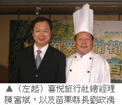 苗栗縣縣長劉政鴻繼推廣桐花季後,又馬不停蹄為苗栗另一項特產~桂竹筍造勢,特別選在台北西華飯店舉辦「2007苗栗桂竹筍饗宴活動」記者會。為了讓民眾能更體會採竹筍及吃竹筍的樂趣,苗栗縣政府特別在4/27~29舉辦桂竹筍的料理競賽及體驗! 劉政鴻表示,苗栗縣光是桂竹林的面積就有3,400公頃,每公頃的桂竹筍產量大約是6千~1萬公斤,產期在4~5月,由於桂竹筍不需使用農藥,因此沒有農藥殘留的問題,加上其特有的高纖維及低熱量,無異是為健康訴求再加分。喜悅旅行社總經理陳富斌也表示,「由於今年雨水充足,生產品質比以往更好,產期也略微提前,遊客可以比往年更早品嘗到好吃的桂竹筍。」顯然,對於業者來說,包裝苗栗地方旅遊,除了桐花祭之外,走健康養生路線的桂竹筍美食體驗,也成了另一項可以強調的賣點。(撰文‧攝影>王志峰)