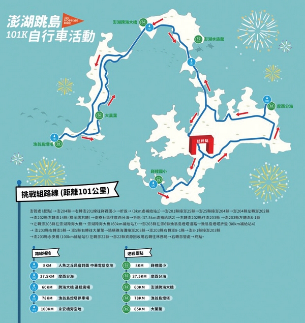 101公里挑戰組挑戰組:澎管處(起點)→澎204縣→右轉澎201線往嵵裡國小→折返→(8km處補給站1)→澎201縣接澎25縣→澎25縣接澎204縣→澎204縣左轉澎202縣→澎202縣右轉澎14縣(標示牌右轉)→南寮社區往摩西分海→折返(37.5km處補給站2)→右轉澎202縣往澎203縣→澎203縣左轉澎8-1縣→左轉澎203縣往澎湖跨海大橋→澎湖跨海大橋(60km補給站3)→澎203縣往澎6縣漁翁島燈塔道路→漁翁島燈塔折返(80km補給站4)→澎203縣右轉澎5縣→澎5縣右轉往大菓葉→過橫礁海灘接澎203縣→澎203縣右轉澎8-1縣→澎8-1縣接澎203縣→澎203縣永安橋(100km補給站5)左轉澎22縣→澎22縣資源回收場右轉往林務局→右轉澎管處→終點。