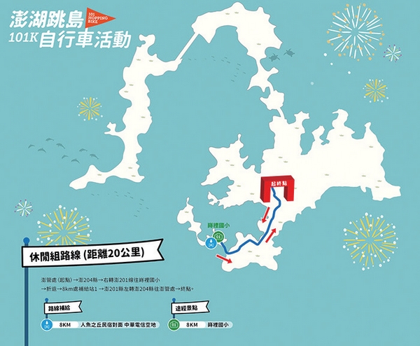 20公里休閒組休閒組:澎管處(起點)→澎204縣→右轉澎201線往蒔裡國小→折返→20km處補給站1→澎201縣左轉澎204縣往澎管處→終點。