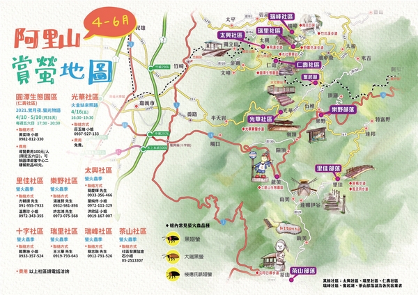 「2021阿里山螢光下的奇幻星旅」賞螢活動,已於3╱25正式揭開序幕,阿里山螢火蟲季為結合多個在地社區、部落(含太興、瑞里、仁壽、瑞峰、奮起湖、十字、光華、里佳、樂野、茶山)推出的夜間賞螢導覽及體驗活動,包括於圓潭生態園區推出「2021.鶯月夜.螢光物語」活動;擁有五星生態(星空、螢火蟲、白面鼯鼠、螢光蕈、高山鯝魚)的光華社區辦理「火金姑來照路」活動;太興社區舉辦螢光照亮太興「螢河鐵道」活動;「2021.鶯月夜.螢光物語」活動及鄒族部落的里佳、樂野、茶山社區等皆提供預約制夜間賞螢導覽服務,結合在地人文產業與生態結合的觀光體驗,詳細情形可參考各社區、部落辦理的活動。
