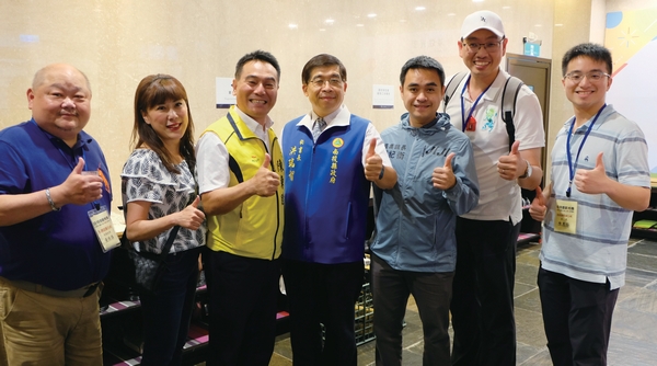 ▲(左起)大創亞旅行社副總經理黃候恭、來來旅行社總經理沈雅卿、竹山鎮鎮長陳東睦、南投縣政府秘書長洪瑞智、集集鎮鎮長陳紀衡、僑益旅行社總經理羅仁宏、山富國際旅行社經理陳其泓。