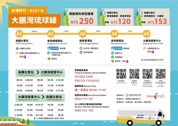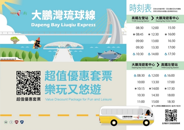 鵬管處表示,台灣好行「大鵬灣琉球線」是首條往返高鐵左營站至大鵬灣的公車,途經東琉線碼頭站、屏客東港站、濱灣碼頭站、大鵬灣遊客中心等共五站,單趟車程約只需70分鐘,每天定時班次往返各15班,亦可預約無障礙公車、載運自行車服務班次,十分便捷,再搭配相關多元套票搭乘,省時、省荷包,讓您輕鬆暢遊大鵬灣週邊景點。