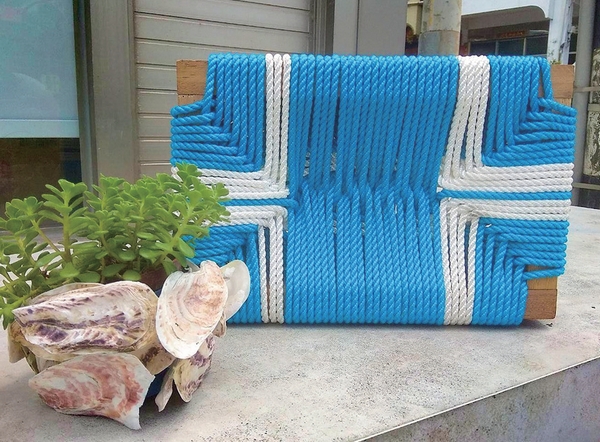 ▲結合地方特色的蚵殼創作、魚線編織以及漁村印花的布藝產品,圖為魚線椅。