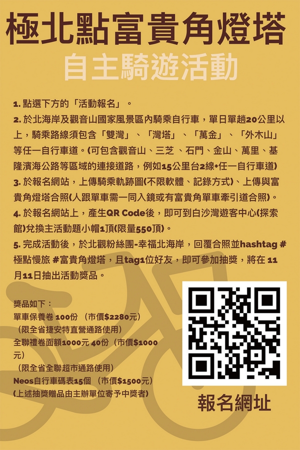 「2021極北點富貴角燈塔自主騎遊系列 活動」分為「極北點富貴角自主騎遊」與 「北海岸自主到訪認證」2大部分,自主騎 遊活動只要參加者報名後騎乘北海岸自行 車道單趟20公里以上,於報名網站上傳騎 乘軌跡圖(不限軟體、記錄方式)及與富 貴角燈塔合照,當下即可獲得QR Code,可 至白沙灣遊客中心兌換活動小帽,並可參 加抽獎,獎項包含捷安特自行車保養券、 全聯現金禮券及自行車碼表等。