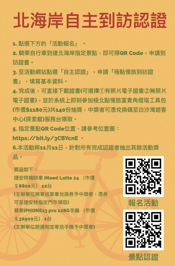而自主到訪認證活動只要參加者報名後 騎乘自行車到達北海岸14處指定景點,即 可掃描立牌上之QR Code,當下即可上網申 請下載到訪證書,並可參加抽獎,獎項包 含iphone13手機、捷安特咖啡腳踏車及單 車維修工具包等豐富獎項。