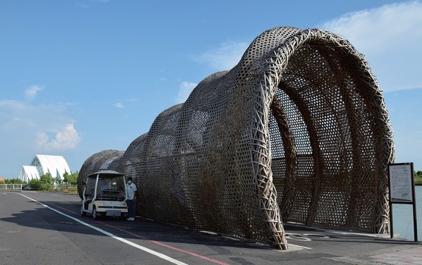 提取魚籠設計元素,透過常用的平編法 製作 出擁有優雅線條的濕地人文入口意象 地景藝 術。 *體─捕魚用竹製魚籠,採六角孔編法,前端 寬大後端窄扁 。 *束─開口處為圓形內縮的構造稱之為輪口收 邊 ,當彈塗魚游進,就無法後退逃出了 。