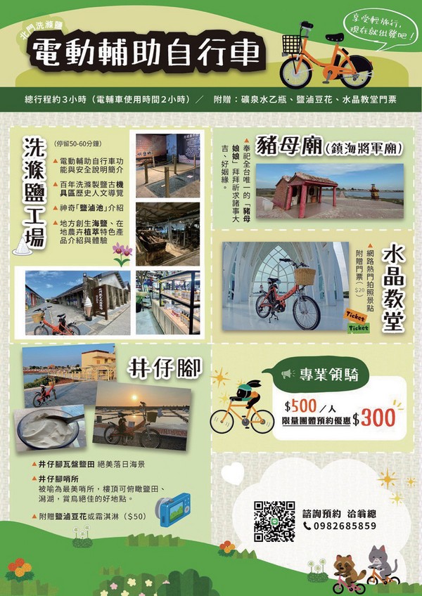 為了不斷推陳出新,吸引初遊客及重遊 客,更為了提供旅客更便利自主的在地遊 程,翁廷芳更推出結合環保概念的電動車 (電動輔助自行車)小旅行,總行程約3小 時,附贈礦泉水1瓶、鹽滷豆花、水晶教堂 門票。自在暢遊洗滌鹽觀光工場、井仔腳、 豬母廟(鎮海將軍廟)、水晶教堂、井仔腳 瓦盤鹽田、海堤鹽田哨所、錢來也雜貨店、 北門遊客中心,更棒的是還有專業領騎帶 路,能真正深度了解在地文化,體驗有別城 市的經典小鎮3.0~北門好風情,保證不虛此 行。