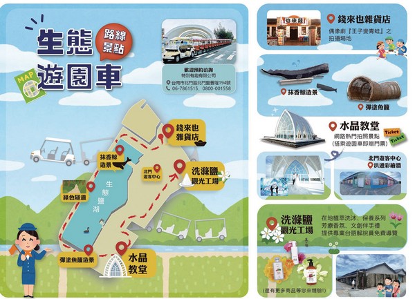 兩小時遊程處處亮點絕無冷場 除此,如果人多還可選擇搭乘造型獨特 的生態遊園車來個兩小時絕無冷場的區域小 旅行,吹著海風遊覽北門遊客中心(鎮館之 寶─全台第2全世界第4大,重達50公噸 14 公尺長的抹香鯨骨骼標本);偶像劇拍攝地 點─鹽工之家~錢來也雜貨店,體驗父執 輩兒時場景充滿懷舊的文青風,這裡也是三立電視台偶像劇「王子變青蛙」拍攝場景; 抹香鯨造景區北門綠色隧道─彈塗魚籠竹隧 道;浪漫唯美的水晶教堂;有東方畢卡索稱 譽的洪通大師彩繪藝術展牆;最後回到洗滌 鹽觀光工場,此行程受到家族旅行和員工旅 遊的熱愛。