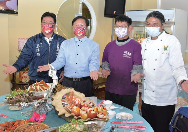▲(左起)嘉義縣議會議員蔡瑋傑、交通部觀光局雲嘉南濱海國家風景區管理處處長徐振能、總舖師「阿翰師」林塏翰、國宴主廚吳文智用美食歡迎旅人看見雲嘉南。