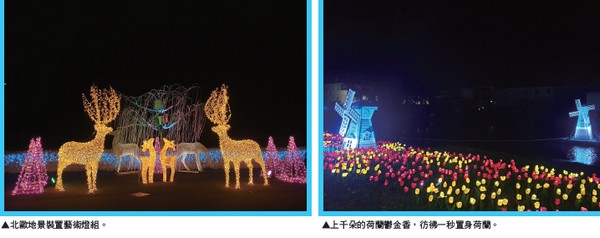 今年是虎年,馬沙溝「福虎生風」主 燈,邀請北港燈藝師吳登興老師及彩繪師 黃志偉老師製作,李聖宮廟埕廣場上百顆 燈籠象徵「百福圓滿」,還有荷蘭、日 本、泰國、北歐地景裝置藝術燈組,雙麟 轉運、飛馬進財,悠遊馬沙溝意象光廊, 眾多燈藝作品,迎春納福精彩馬沙溝。 馬沙溝瀰漫多國風情 還可吃現撈海鮮跟烏魚子 元宵佳節哪裡去,台 南將軍馬沙溝「2022漁 觀食色地景藝術季」,將 軍漁港看海景吃現撈海鮮 跟烏魚子,晚上賞地景光 影藝術,上千朵的荷蘭鬱 金香,愛戀櫻花、日本鳥 居、泰國大象椰子樹、都 在馬沙溝精采呈現,還有 旋轉木馬、魚影迷蹤迷 宮,歡迎來走春賞燈歡樂 過元宵。
