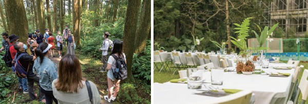 白天旅客也能在森林療癒師帶領下, 用自己的雙腳感受森林帶給人們的寧靜, 用鼻腔感受森林芬多精對人體的影響,用 身體或抱、或坐、或臥,讓自己與樹木獨 處,搭配結合森林療癒及頌缽的「療癒森 頌」放鬆身心靈,把一切煩惱憂愁都帶 走。當然也有吸引饕客的「森林餐桌」, 用在地的食材、古法烹調,用味覺重新回 味這趟溪頭森林之旅。