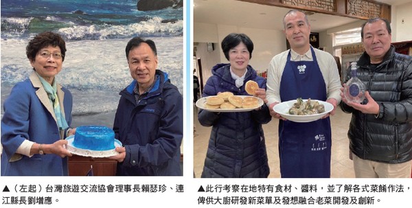 為順利推進馬祖食宿服務品質,保留在 地特色風味,特請台灣旅遊交流協會理 事長賴瑟珍親率國宴大廚陳兆麟、台北福 華大飯店蓬萊邨主廚王宗永、曾獲米其林 一星的陳永華、前華膳空廚行政總主廚陳 玉彬及北竿芹沃咖啡烘焙館曾美子老師, 並邀請資深美食記者王瑞瑤等5位共赴馬 祖踩線,此行考察在地特有食材、醬料, 並了解各式菜餚作法,俾供大廚研發新菜 單及發想融合老菜開發及創新。