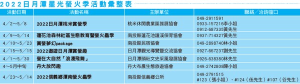 每年四月起進入賞螢季節,日月潭地區因生態資源豐富,復育有成,螢火蟲族 群數量增加,每年都吸引大批遊客追逐螢 光,日管處今年與7個在地單位攜手推出 各項賞螢體驗活動,各項遊程相當豐富。 除了夜間賞螢活動搭配生態解說導覽之 外,遊客可選擇白天桃米生態村的魚蝦生 態探索、樹葡萄採果等多元農事體驗,或 是下午先到水社地區,來一趟步道漫遊, 或是體驗立槳活動與潭邊野餐。丹大與潭 南地區也針對賞螢活動推出原民文化體 驗,包含布農歌舞展演、教學,部落巡 禮,原民晚餐,在賞螢之前還有部落星空 晚會活動。從白天到晚上的行程,非常適 合全家大小一起前來,白天在美麗的山林 和潭水小溪間,感受自然文化的洗禮體 驗,夜裡看著成群的螢火蟲在眼前飛舞, 燃起綠色光譜。