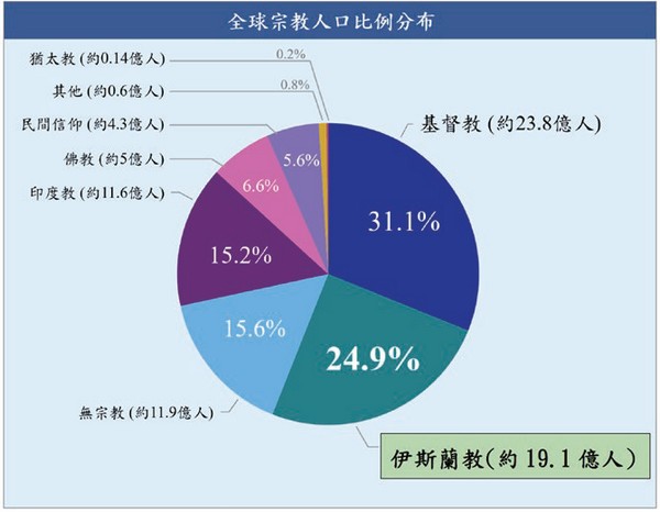 ★伊斯蘭教是目前世界上僅次於基督教的第二大宗教,信仰伊斯蘭教之 信徒,則稱之為穆斯林。根據美國皮尤研究中心(Pew Research Center) 研究指出2020年全球穆斯林人口將達19.1億,占全球人口約24.9%,約 每4人中就有1人信仰伊斯蘭教。根據該中心的數據,全球有62%的穆斯 林居住在南亞和東南亞地區,有著超過十億的人口,其中印尼是擁有最 多穆斯林人口的國家,占全世界12.0%,其次是印度11.1%、巴基斯坦 10.5%和孟加拉國8.0%,另20%的穆斯林居住在中東的阿拉伯國家地 區,而鄰近臺灣的中國大陸,穆斯林人口也有2,200萬之多。