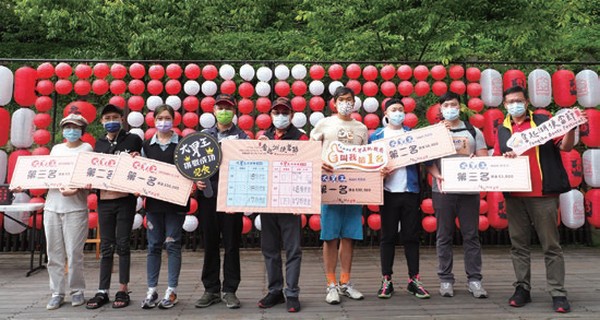 ▲阿里山管理處處長洪維新(左6)表示,奮起湖大胃王挑戰賽男 子組第一名花30分鐘將近完食8家便當;女子組第一名則是僅花 25分44秒完食8家便當,均是非常的不簡單。