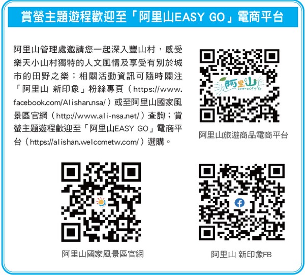 阿里山管理處處長洪維新表示,「豐山村—螢河星空下 的派對饗」以賞螢概念為出發,結合豐山疊石引路的開墾典 故、星空下的音樂饗宴與夜間生態賞螢導覽活動,串連成獨 特的旅遊模式,讓遊客沈浸在琴聲悠揚的星空下用餐,感受 大自然的生態之美。