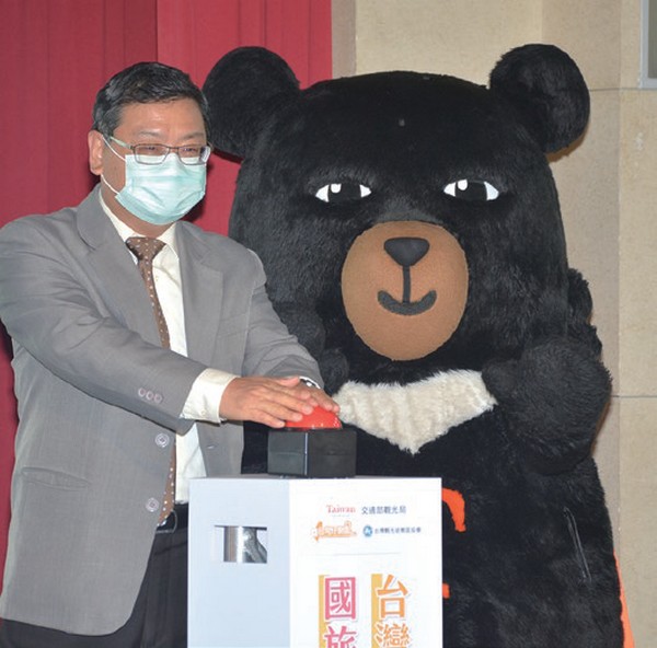 ▲觀光局局長張錫聰與喔熊一起抽出多項獎項。