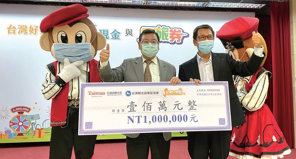 ▲百萬元中獎得主來自九族文化村。(左起)觀光局局長張錫聰、九族文化村企劃部經理黃瑞奇開心合影。