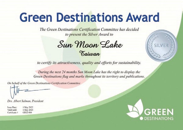 因應氣候變遷全球暖化所帶來的生存危機,「永續」已成為全球各產 業共同發展目標,如何透過日常行動落實永續與系統化管理,使產 業在經濟蓬勃發展下均能兼顧,更是時下最熱門的議題。交通部觀光局日 月潭國家風景區管理處(以下簡稱「日管處」)3年多來的積極投入,於 今年5月獲得由荷蘭綠色旅遊目的地基金會所主辦的「綠色旅遊目的地國 際認證(Green Destinations Awards╱Certification)肯定,取得「綠色旅遊目 的地認證銀質獎」,用行動為疫後觀光新局奠定根基!