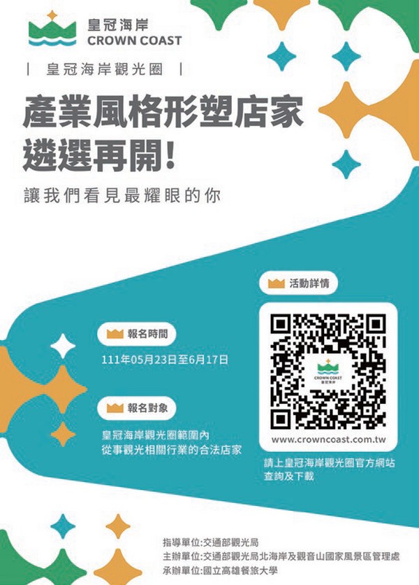 由交通部觀光局北海岸及觀音山國家 風景區管理處(下稱北觀處)委託 國立高雄餐旅大學執行「皇冠海岸觀光 圈」產業風格形塑店家遴選,即將再開名 額,歡迎皇冠海岸觀光圈範圍內的觀光業 者踴躍報名參加,入選店家將有業界輔導 專家進場進行企業診斷及相對應的改變計 畫,想要提升服務品質的你們千萬不要錯 過。