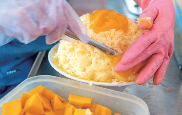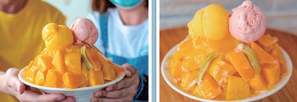 不同於其他冰店都是清冰搭配芒果,張秀玲特別將芒果打 成之後急速冷凍,形成芒果冰磚作為整碗冰的基底,然後鋪上 一層芒果片,淋上芒果果肉泥之後,滿滿新鮮現切的果實,加 上特別添加的情人果,最後放兩球芒果冰淇淋,將盤子盛得滿 滿,造就一碗視覺與味覺都是饗宴的芒果無雙。純天然的呈 現,加上沁涼的冰,以及香甜的愛文芒果加上情人果的微酸口 感,總是讓人難以抗拒,尤其當家庭號的芒果冰端上桌時,總 會聽到一旁客人的驚嘆聲,不難想像冰品的壯觀。