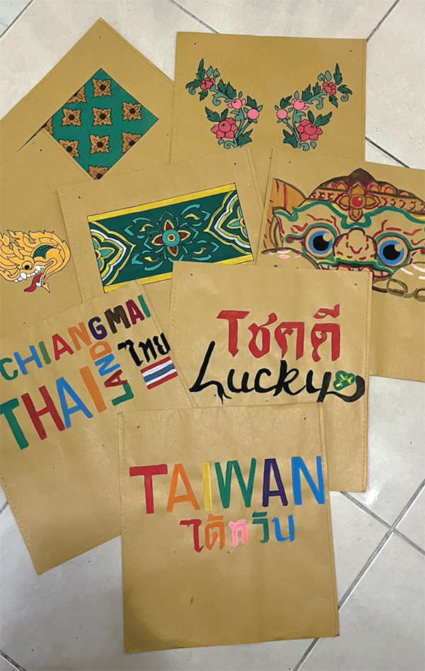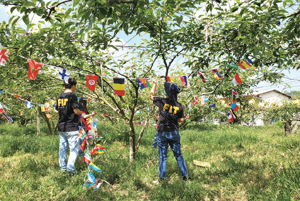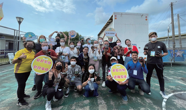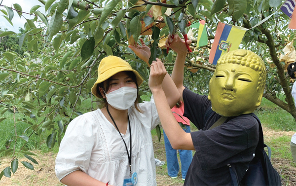 其中來自越南的學生說道,我用家鄉 元素的梨袋為台灣的梨子遮風擋雨,就 像Friendship in Taiwan為來自世界各地 的我們建立了一個避風港。經由梨袋的妝點,讓梨樹出現不同以往的風格,展 現五彩繽紛,點綴梨子園滿滿的異國風 格。
